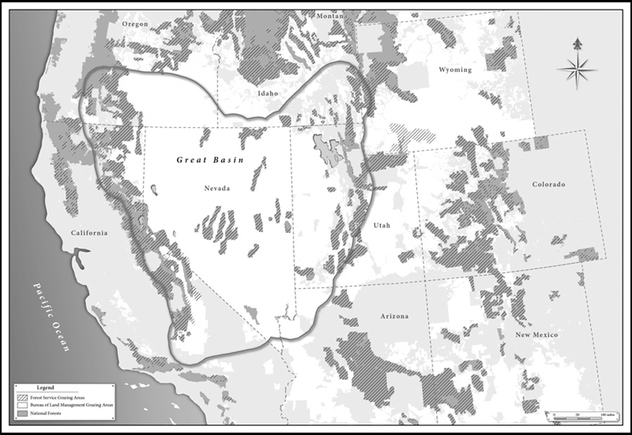 Map of Bureau of Land Management Grazing Areas and Forest Service areas in the Great basin included in the book "The Size of the Risk: Histories of Multiple Use in the Great Basin." " |